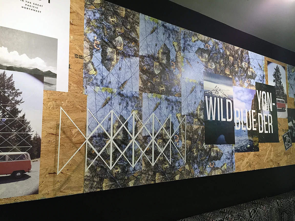 2016 - Day One - Wheat Pasted OSB Walls, Laser-cut Steel Stand Offs, White Oak and Stone Farm Tables, Vinyl Stools, Custom Upholstered Built-ins, Dimensional Letters