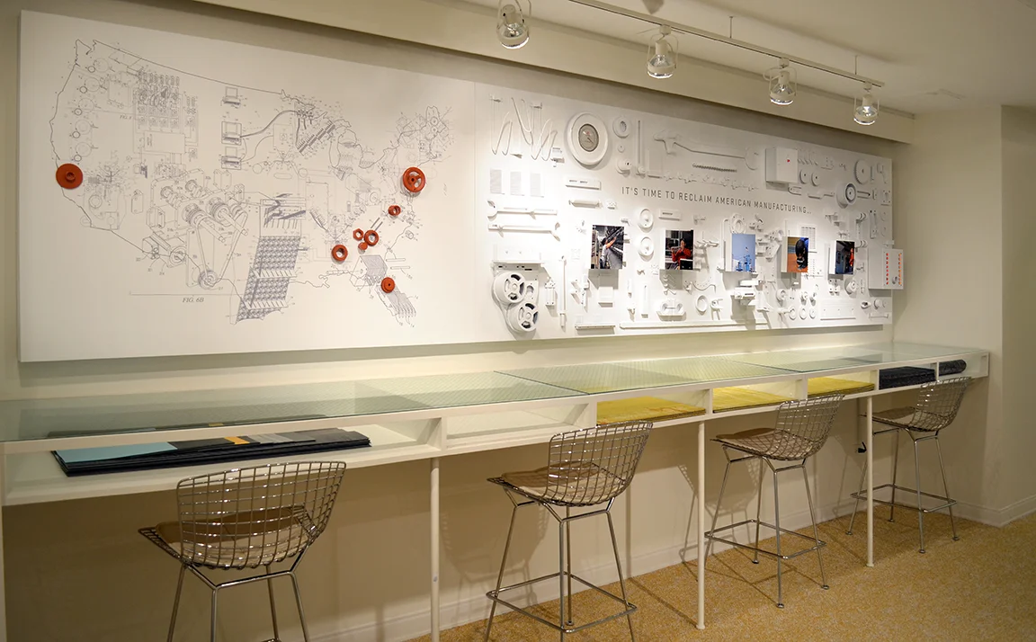 2013 - CNC Cut Panel Display, Custom Steel Hardware, Reclaimed Wood and Steel Work Tables, Digitally-printed Map Display, Custom Light Fixtures